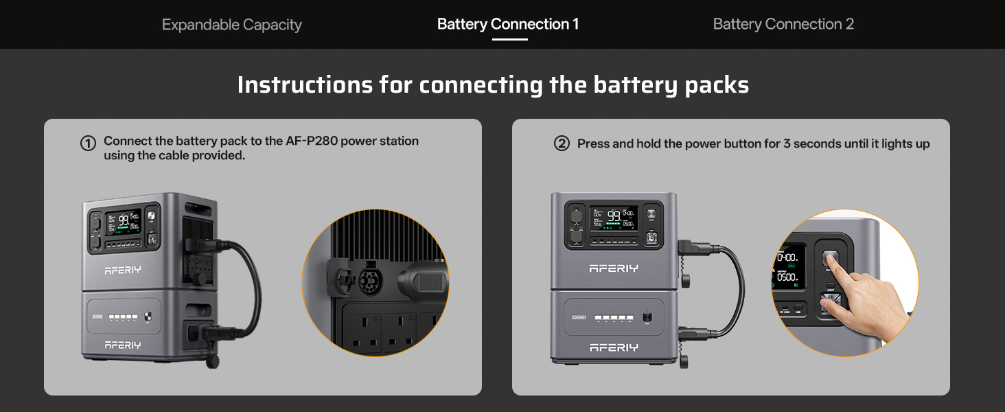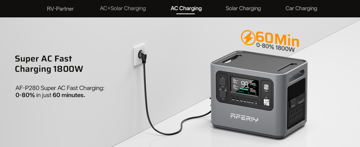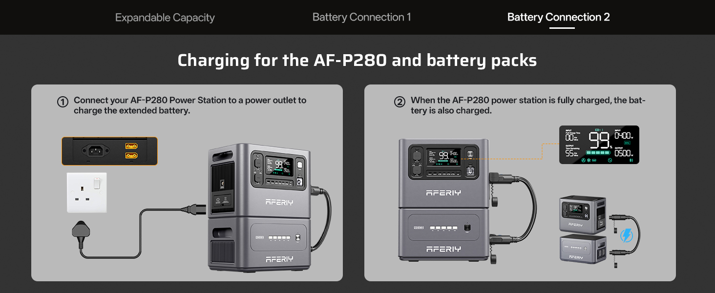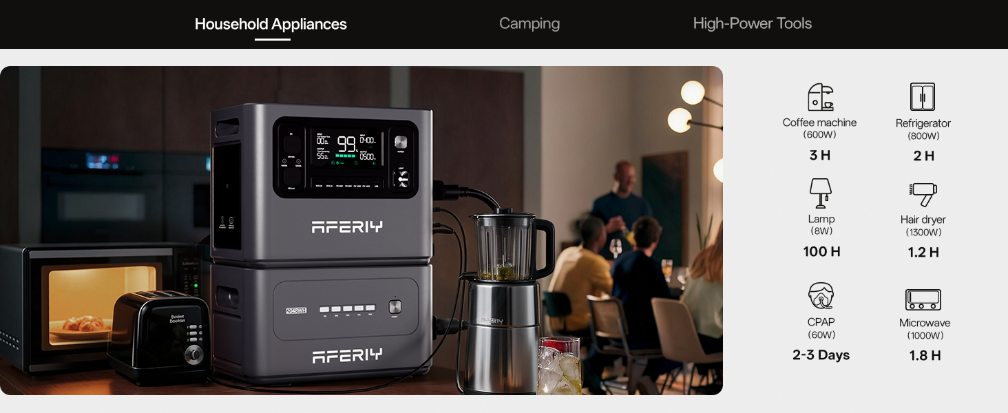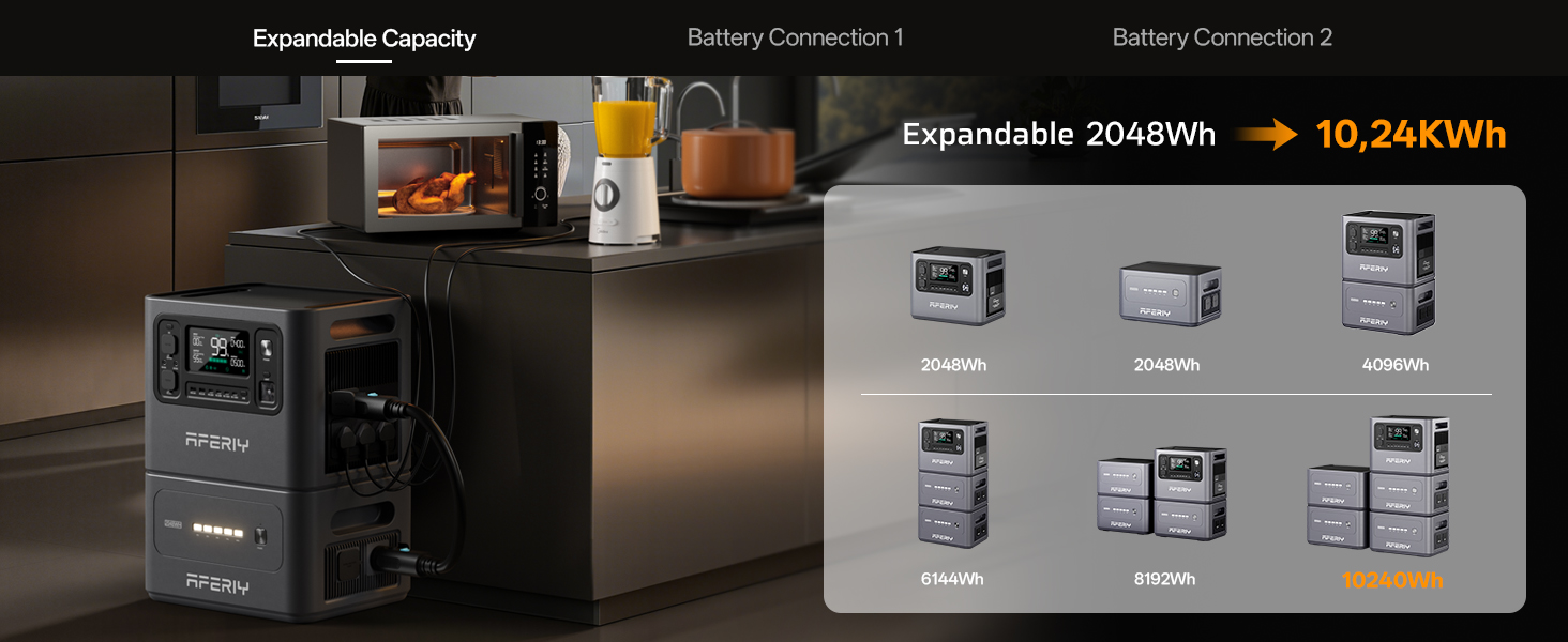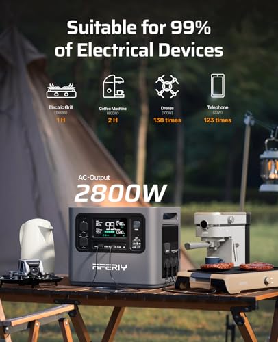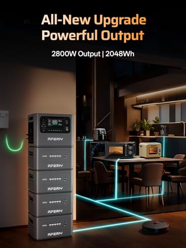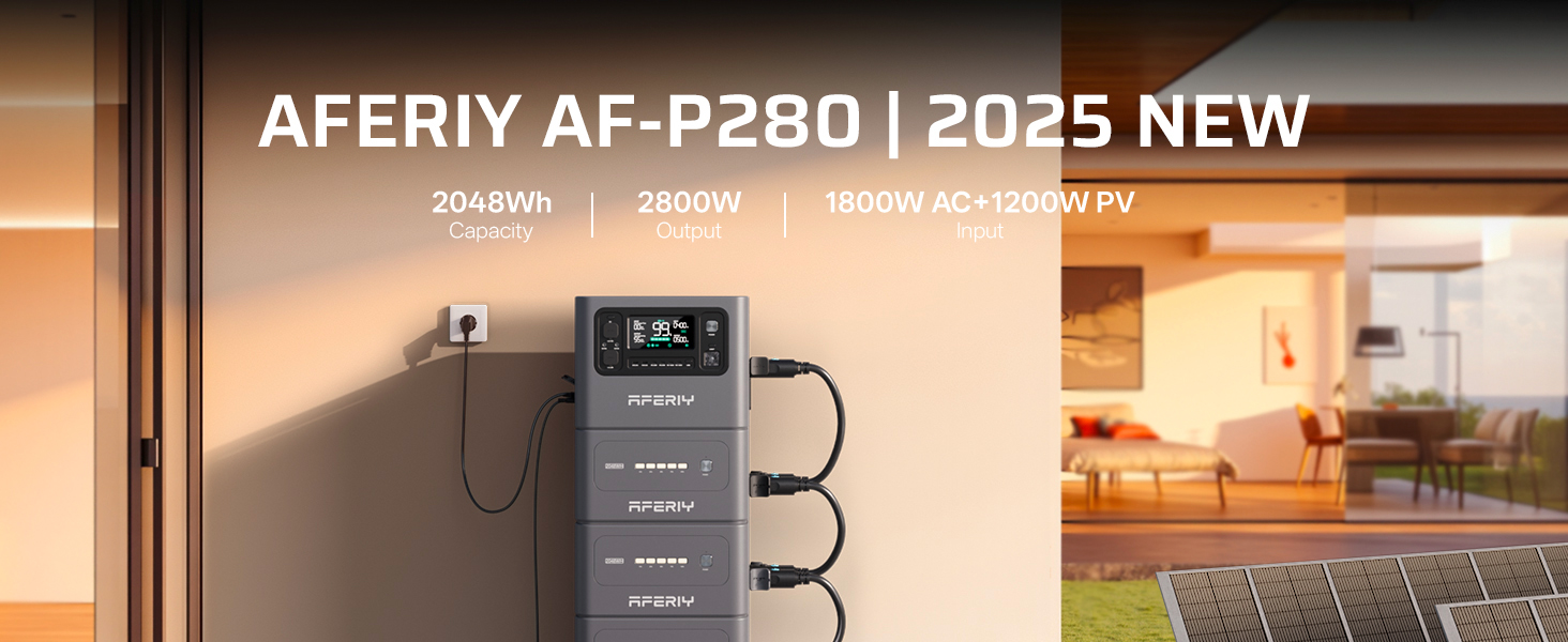 【Complete Upgrade】The AFERIY portable power station P280 increases its power output from 2400W to 2800W, allowing you to power more demanding appliances such as electric ovens, microwaves, refrigerators, and more. It features a LiFePO4 battery with a 2048Wh capacity, and the P280 model supports adding 1 to 4 extra batteries, expanding its total capacity up to 10.24 kWh (additional batteries are sold separately).