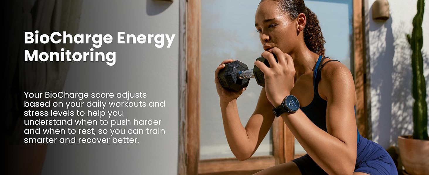 - BioCharge Energy Monitoring: Your BioCharge score adjusts based on your daily workouts and stress levels to help you understand when to push harder and when to rest, so you can train smarter and recover better.