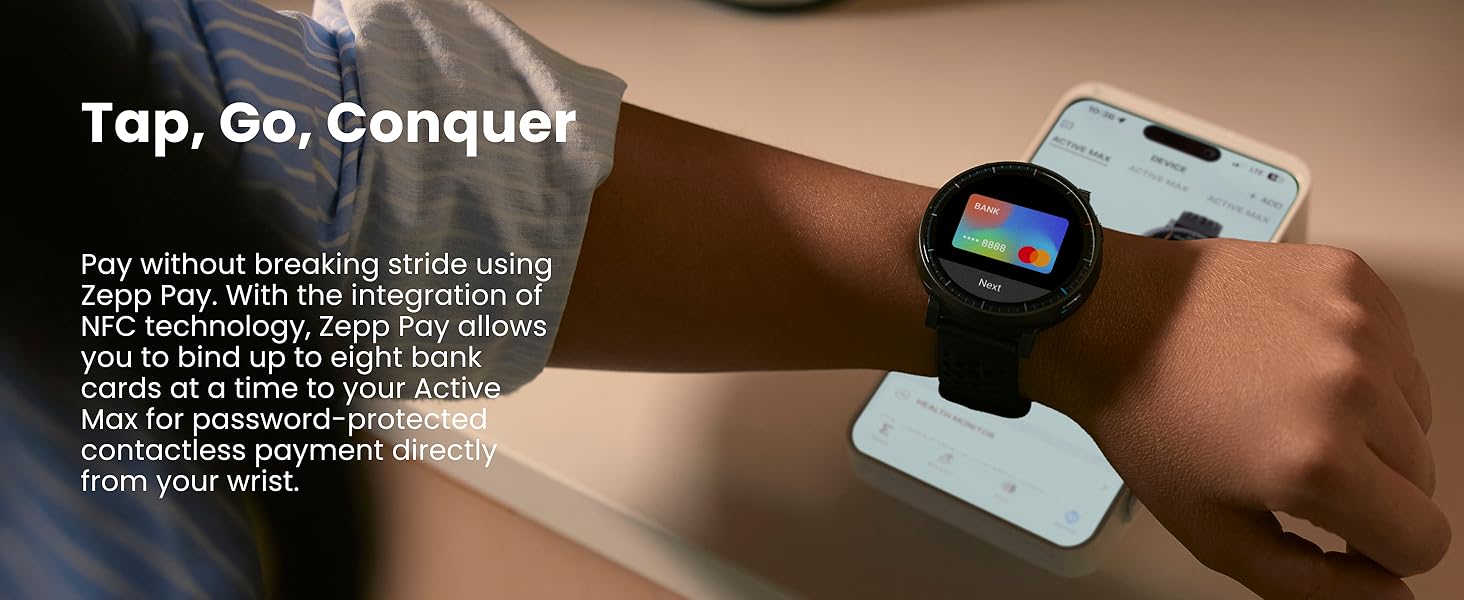 - Contactless Payment: Pay without breaking stride using Zepp Pay — your workouts don’t stop at the checkout line.With the integration of NFC technology, Zepp Pay allows you to bind up to eight bank cards at a time to your Active Max for password-protected contactless payment directly from your wrist.