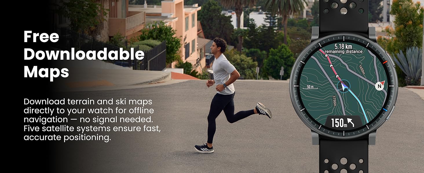 - Free Downloadable Maps: Download terrain and ski maps directly to your watch for offline navigation — no signal needed. Built-in positioning with five satellite systems ensures fast, accurate tracking everywhere you go.