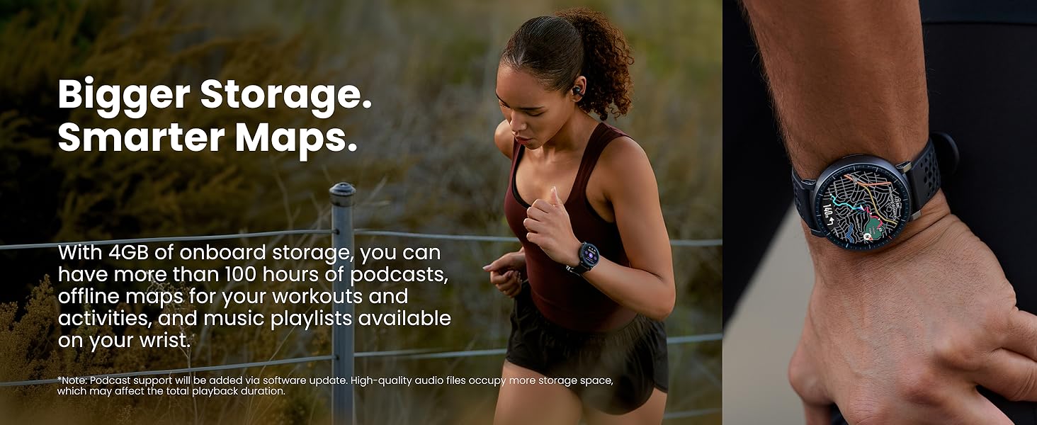 - Bigger Storage. Smarter Maps: With 4GB of onboard storage, you have more space for your favorite music and downloaded maps with turn-by-turn directions — all accessible right from your wrist.