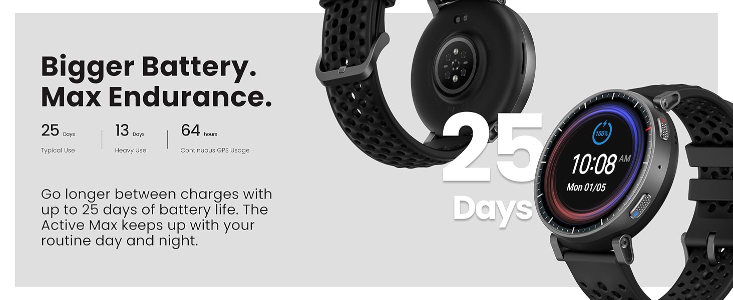 - Bigger Battery, Max Endurance: Go longer between charges with reliable power built for every routine. With up to 25 days of battery, the Active Max smart watch keeps up with your routine day and night.