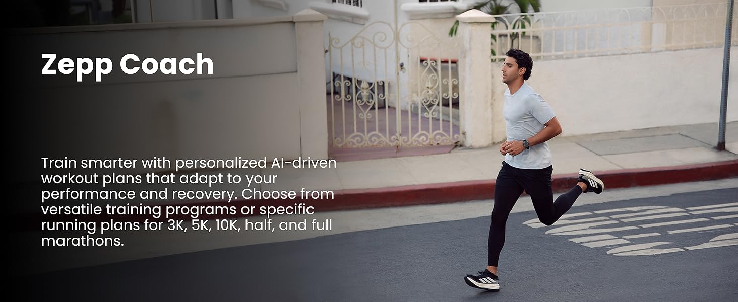 - Zepp Coach: Train smarter with personalized AI-driven workout plans that adapt to your performance and recovery. Choose from versatile training programs or specific running plans for 3K, 5K, 10K, half, and full marathons