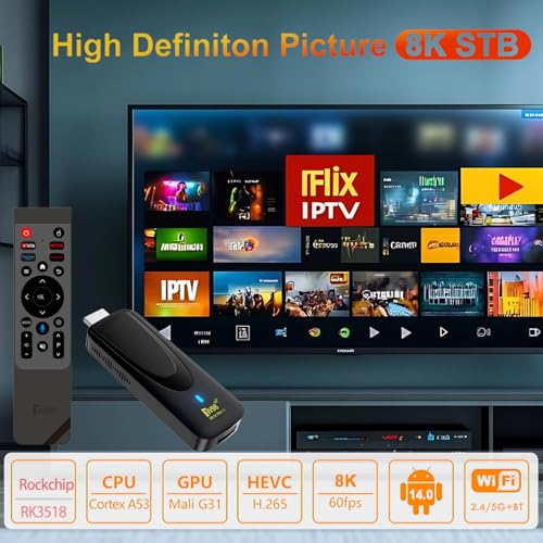 1.Powerful Performance for Smooth Streaming Equipped with Rockchip RK3518 Quad-Core Cortex-A53 CPU and Mali 450 MP2 GPU, this TV stick delivers fast processing and smooth multitasking. Choose between 1GB/2GB RAM and 8GB/16GB flash to store your favorite apps and media files, ensuring lag-free performance for streaming, browsing, and app usage. 2.Stunning 4K Visuals & Rich Audio Enjoy cinema-like experiences at home with 4K@60fps UHD output via HDMI 3.0A—supports H.265, VP9, AVS2, and more popular video formats. The advanced video engine enables multi-format decoding, while the audio system supports MP3, FLAC, Ogg, and 7.1/5.1 down-mixing, plus SPDIF/PCM outputs for immersive sound. 3.Seamless Connectivity & Versatile Use Dual-band WiFi (2.4G+5G) & Bluetooth 5.0: Fast, stable connections for streaming, gaming, and pairing with wireless mice/keyboards. Android 14.0 OS: Access thousands of apps from Google Play, Amazon Appstore—supports Netflix, YouTube, Hulu, Skype, and social media Multiple I/O Ports: 1x HDMI, 1x USB Host, IR receiver—works with HDDs, USB drives, TF cards for local media playback. 4.User-Friendly Design & Global Compatibility Sleek black plastic body (108x36x15mm) fits any TV setup. Supports multilingual interfaces (English, French, German, Spanish, Italian, etc.) and DLNA function. The package includes all essentials: HDMI cable, voice remote control, user manual, and USB charging cable. Ideal for streaming online videos, video calls, office work, and local media playback—turn any TV into a smart entertainment center!