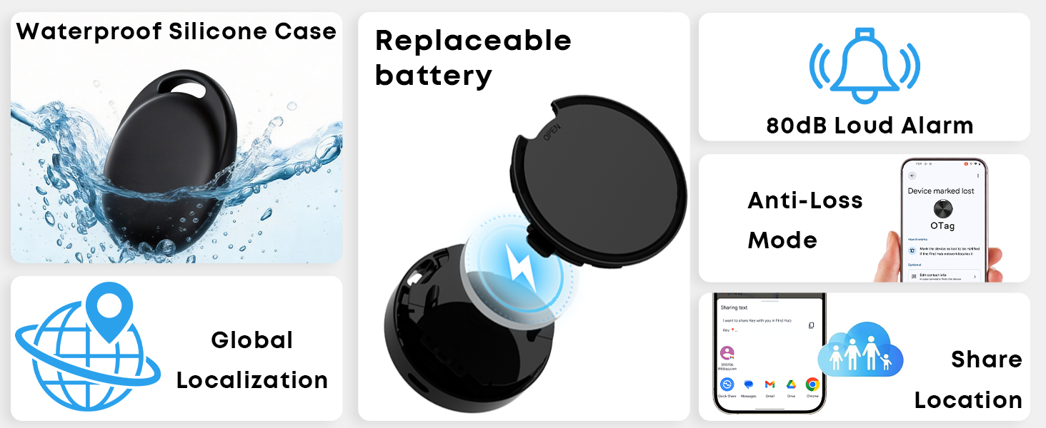 【Removable Battery & Waterproof Case】 Made of high-quality plastic, this tracker tag android is equipped with a CR2032 button battery, featuring dustproof performance and a removable battery design. Powered by the latest CR2032 battery, it has a long service life. Tracking tag with the waterproof silicone case ensures stable operation even in harsh environments such as rainy days and dusty areas.