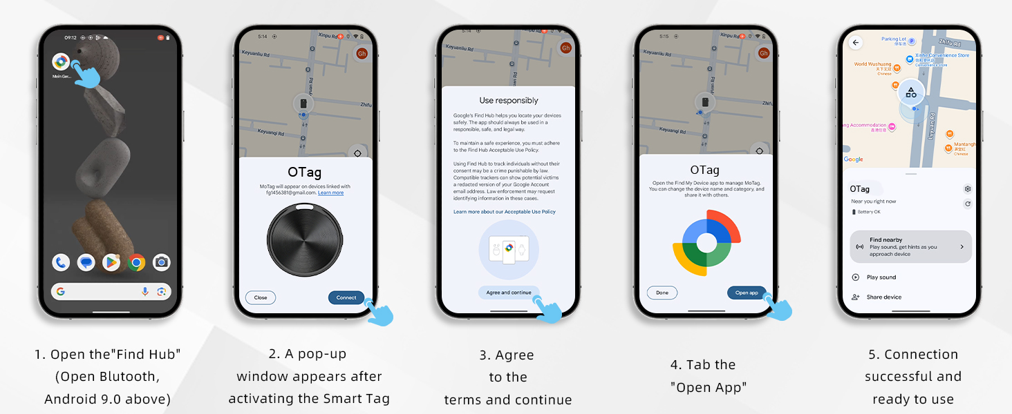 【Privacy Security & Pairing Operation】 This Google-Certified Bluetooth android tag effectively safeguards your personal information. All communications with the Google "Find Hub" app are anonymous and encrypted, and location data and historical records are not stored in the suitcase tracker. Through the "Find Hub" app, One Android device can bind multiple luggage tags at the same time, making it easy to locate and manage items.