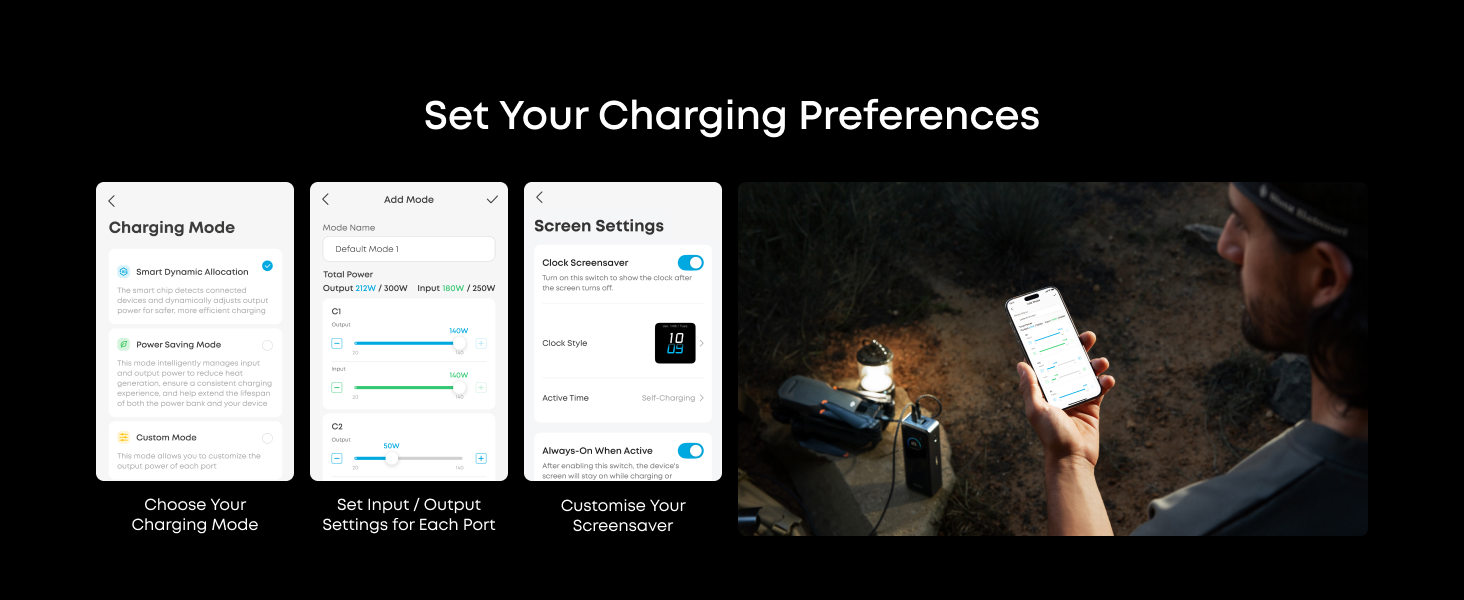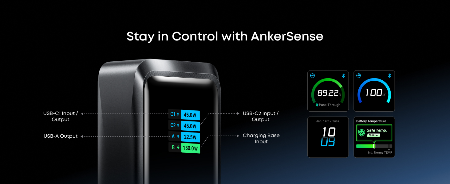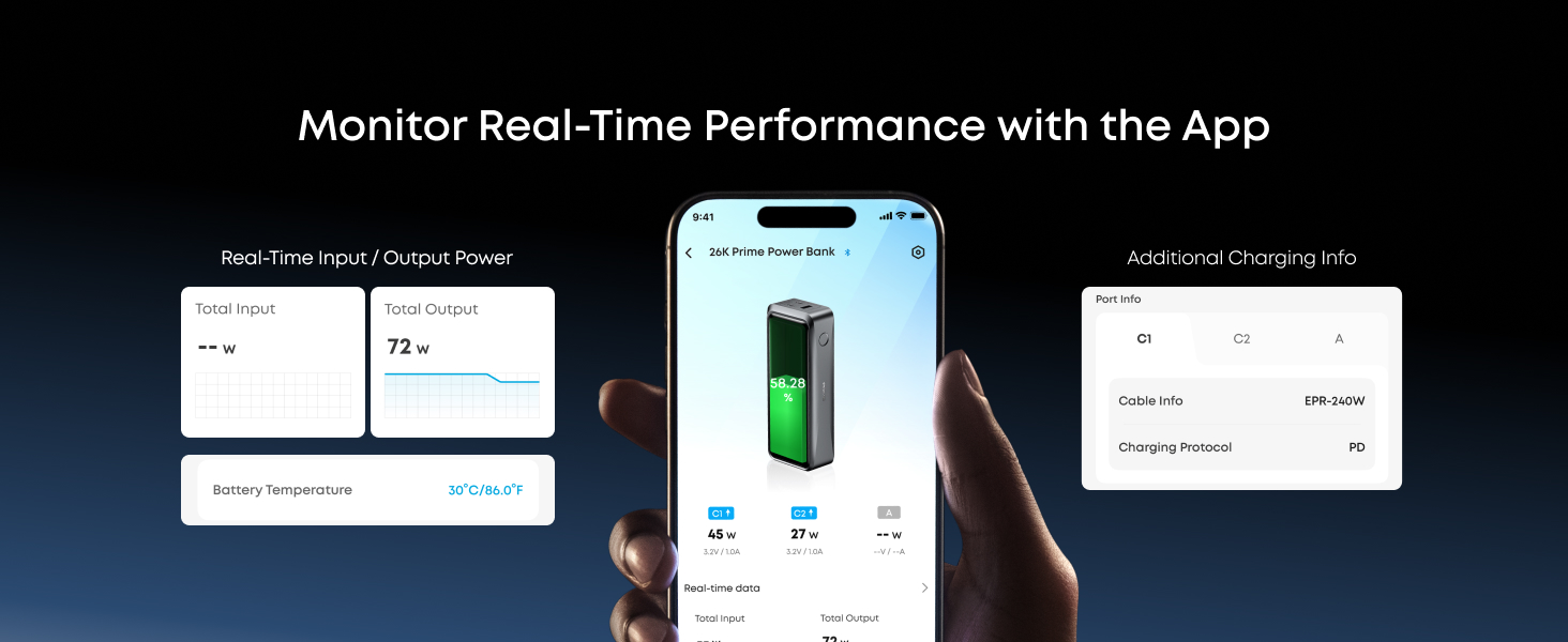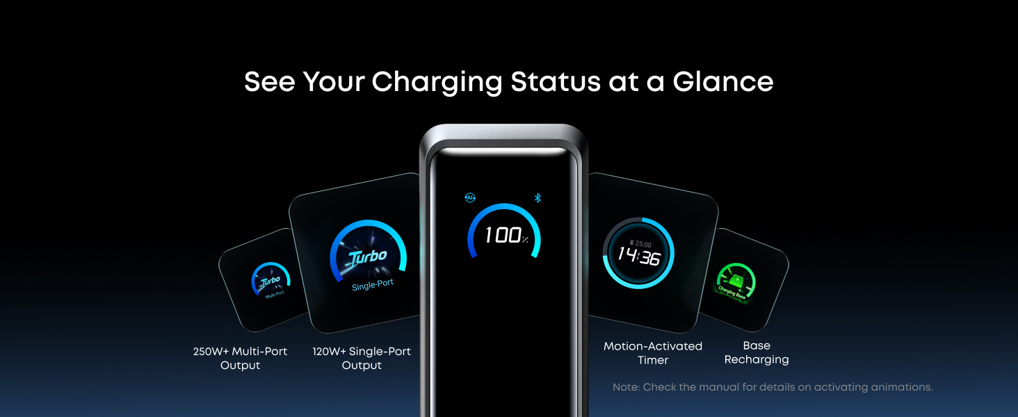 - Smart Display and App Control: Take charge of your power with a smart display that provides rovides detailed charging information of the power bank and charging base, and allows manual adjustments of output power on the app.