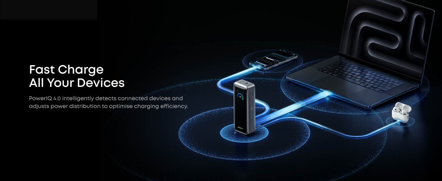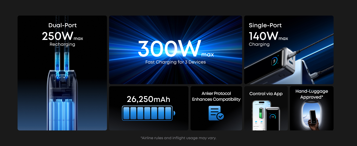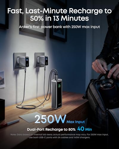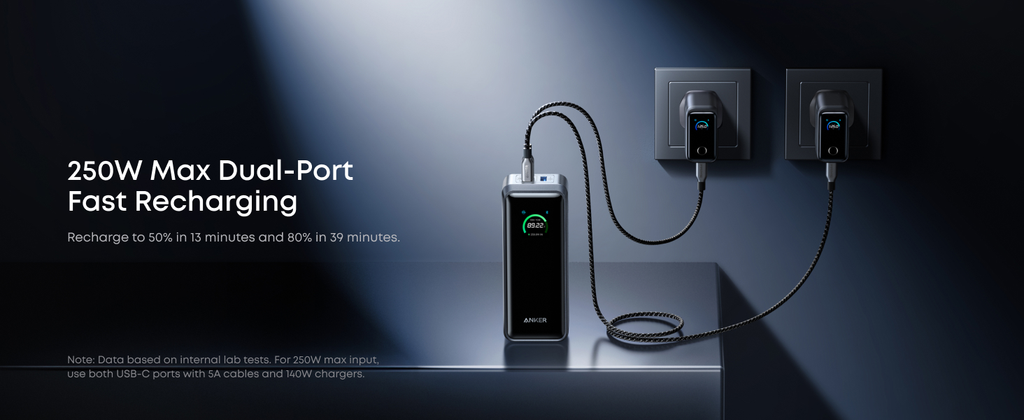 - Recharge at Top Speed: Recharge to 100% faster than ever with Anker's first power bank that supports dual-cable 250W max recharging. Spend less time recharging and more time doing.