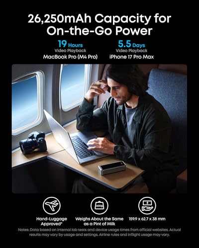 - Power Through Your Flight: Enjoy massive 26,250mAh (99.75Wh) capacity to charge a MacBook Pro (M4) up to 0.8 times with a compact power bank that's flight-approved and ready for travel.