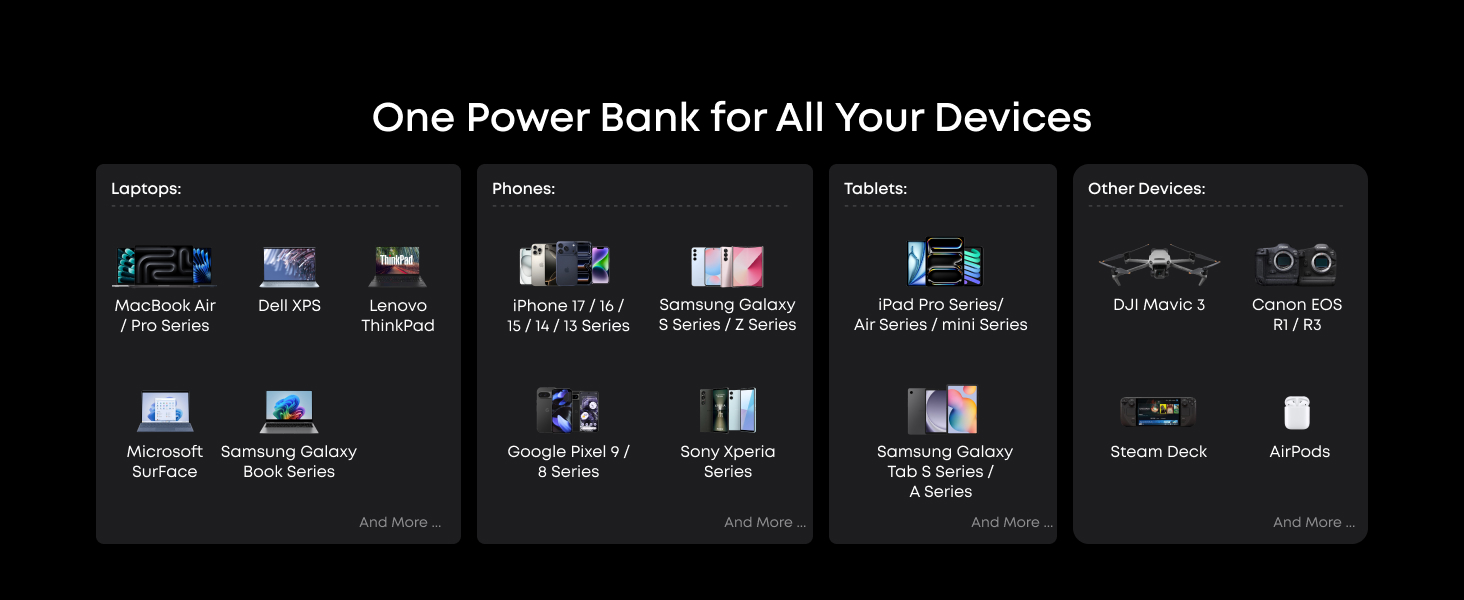 | Compatible Devices | For Laptops, Phones, Tablets | For Laptops, Phones, Tablets | For Laptops, Phones, Tablets | For iPhone, Watch, Earbuds | For Tablets, Cellular Phones | For macOS,Windows,DisplayLink | Smartphones |