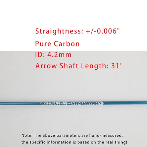 Product Details: Material: Pure Carbon Straightness: +/-0.006″ Spine: 400/500/600/700/800/900/1000 spine Overall length: 31 inches Inside diameter: 4.2mm Note: All the above parameters are measured manually there may be errors, the specific information is based on the real thing.