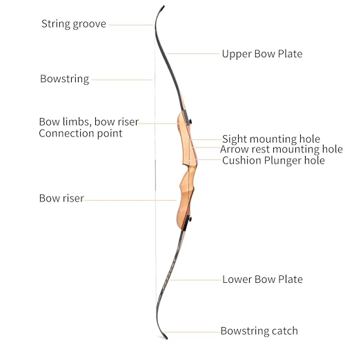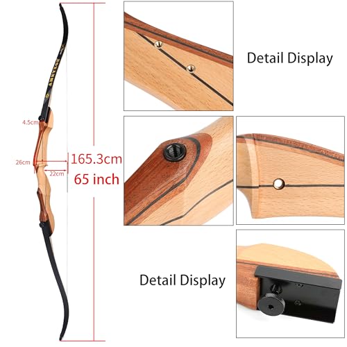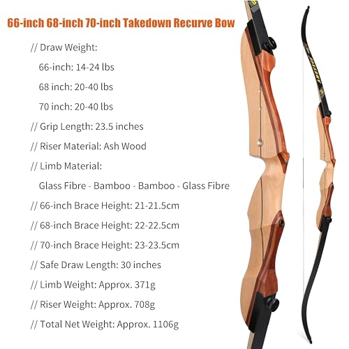Takedown wooden recurve bow, available in 66 inches (12-24 lbs), 68 inches (20-40 lbs), and 70 inches (20-40 lbs), with increments or decrements of 2 lbs per size.