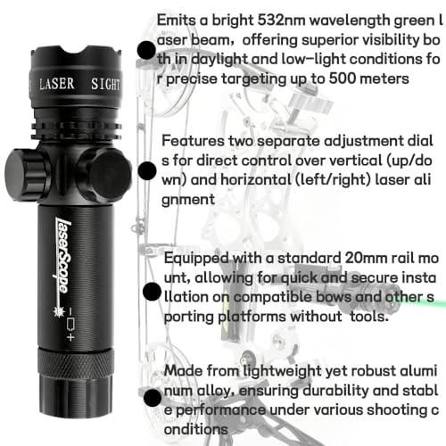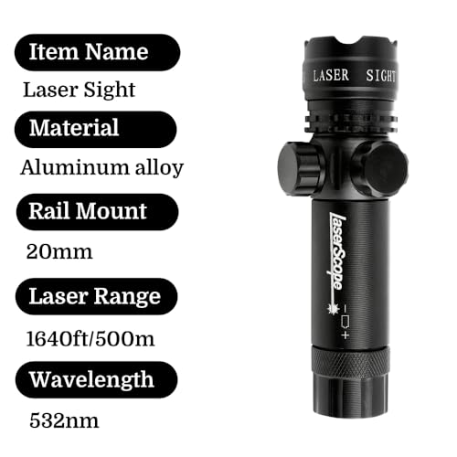 Item name: Archery Laser Sight Scope Color: Black Material: Aluminum alloy Light Color: Green Rail Mount: 20mm Laser Range: 1640ft/500m Laser Wavelength: 532nm Package Size: 18.5*11.5*4.5cm Weight: About 230.8g Package include: 1x laser sight+charger+box Note: 1.Due to shooting angle and light. There will be errors in color. 2.The above parameters are all measured manually, there will be errors. The actual item shall prevail.