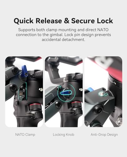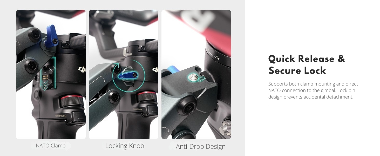 【Quick-Release Dual Mount System】 Equipped with NATO Rails for direct mounting on DJI RS series gimbals, or connect via the middle bridge adapter for other gimbals without NATO mounts — fast setup for any rig.