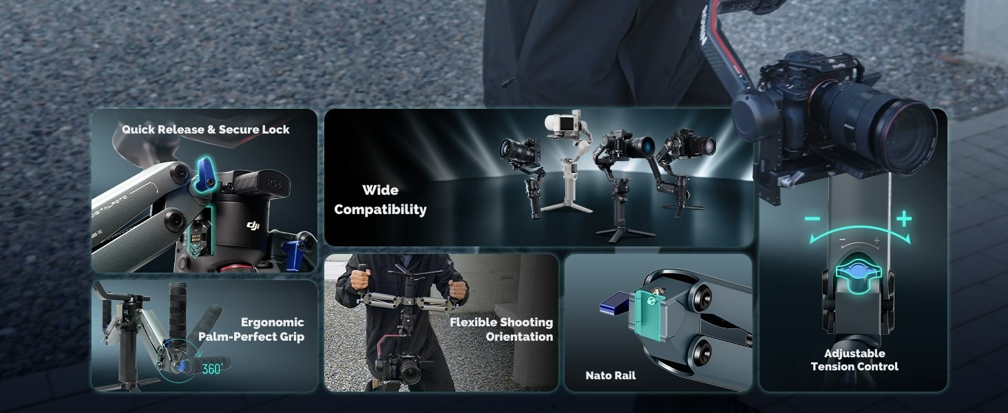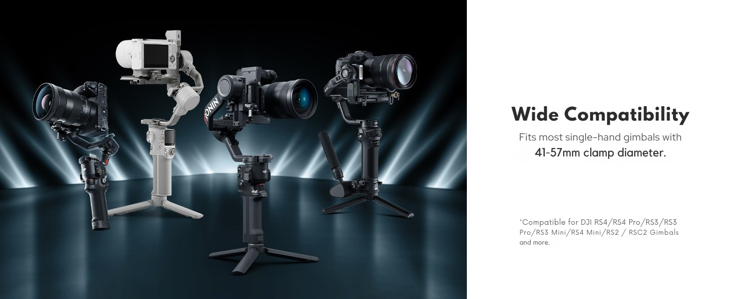 【Wide Compatibility for DJI RS Series Gimbals】 Compatible for DJI RS5 RS 4 /RS 4 Pro/RS 3 / RS 3 Pro/RS 3 Mini/RS 4 Mini/RS 2 / RSC 2 Gimbal and most single-hand stabilizers with handle diameter 41–57mm, supporting 2–5kg payload.