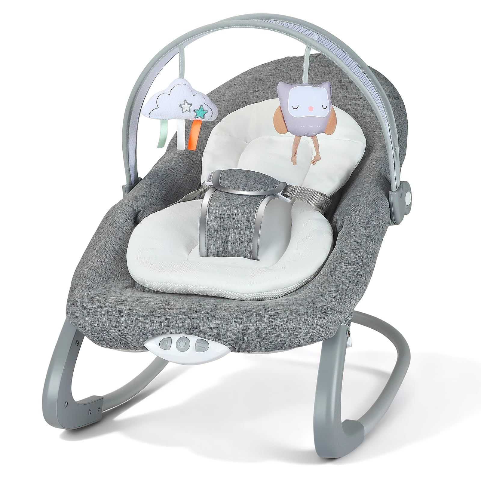 - 【Removable Toy Bar with Interactive Toys】 2 adorable toys sway with the baby bouncer from birth, encouraging your baby's natural reaching and batting instincts to stimulate sensory development. The toy bar is detachable, allowing effortless switching between rest and play modes