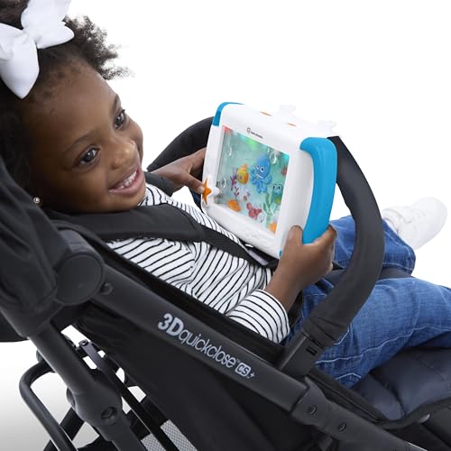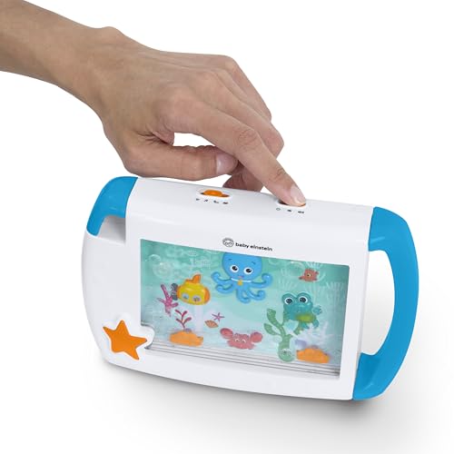 Keep your baby calm and entertained at home or on-the-go with the Baby Einstein On-the-Go Sea Dreams Soother. Featuring 15+ minutes of engaging lights, dancing characters, and classical melodies, this portable soother from the #1 Manufacturer of Baby Toys* features 4 modes for screen-free fun and soothing wherever you go. Modes: upbeat melodies, soothing, ocean sounds, and underwater sounds. Lights gently pulse to the music. Clip to your baby’s stroller or use the kickstand to place the soother on a tabletop while dining out. Easy-grasp handles let toddlers carry and interact with the soother. Requires 3 AA batteries. Wipes clean. Dimensions: 1.79 x 8.09 x 5.18 inches. For ages 0+ months. (*Circana US dollar sales, Jan-Dec 2024)