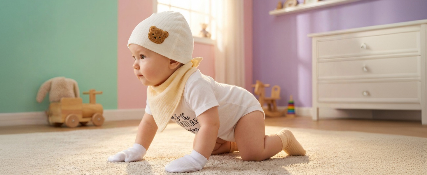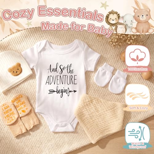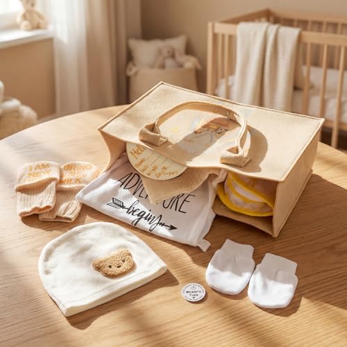 【BABY SHOWER GIFTS & NEWBORN GIFT SET】All-in-one baby gift basket with everyday infant essentials: breathable onesie, warm hat, protective mittens, cute socks and absorbent bib. Arrives in premium felt bag—ready-to-gift for newborn arrival, baby shower gifts for girls or boys.