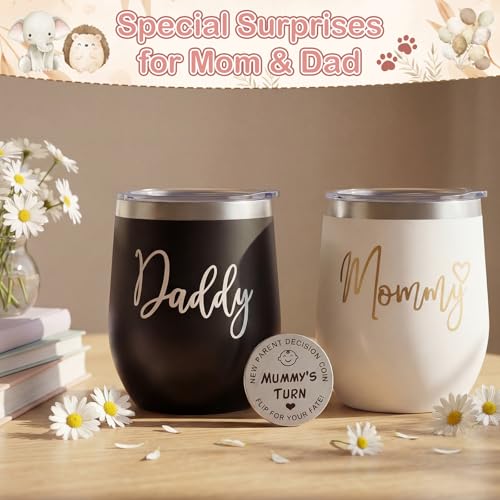 【NEW DAD GIFTS & NEW PARENTS GIFTS FOR COUPLES】Two insulated “Mum & Dad” tumblers keep drinks hot/cold for hours, plus a funny decision coin to settle diaper duty debates. This new parents gifts for couples set celebrates both mum and dad equally—ideal gender reveal gifts and baby gift basket.