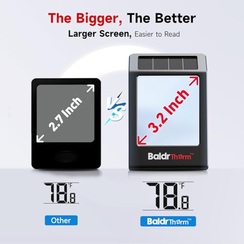 BaldrTherm Room Thermometer Indoor Humidity Meter, Solar-Powered 3.2'' Large Digital Temperature Sensor Monitor with Max/Min Reading (Black 3P)