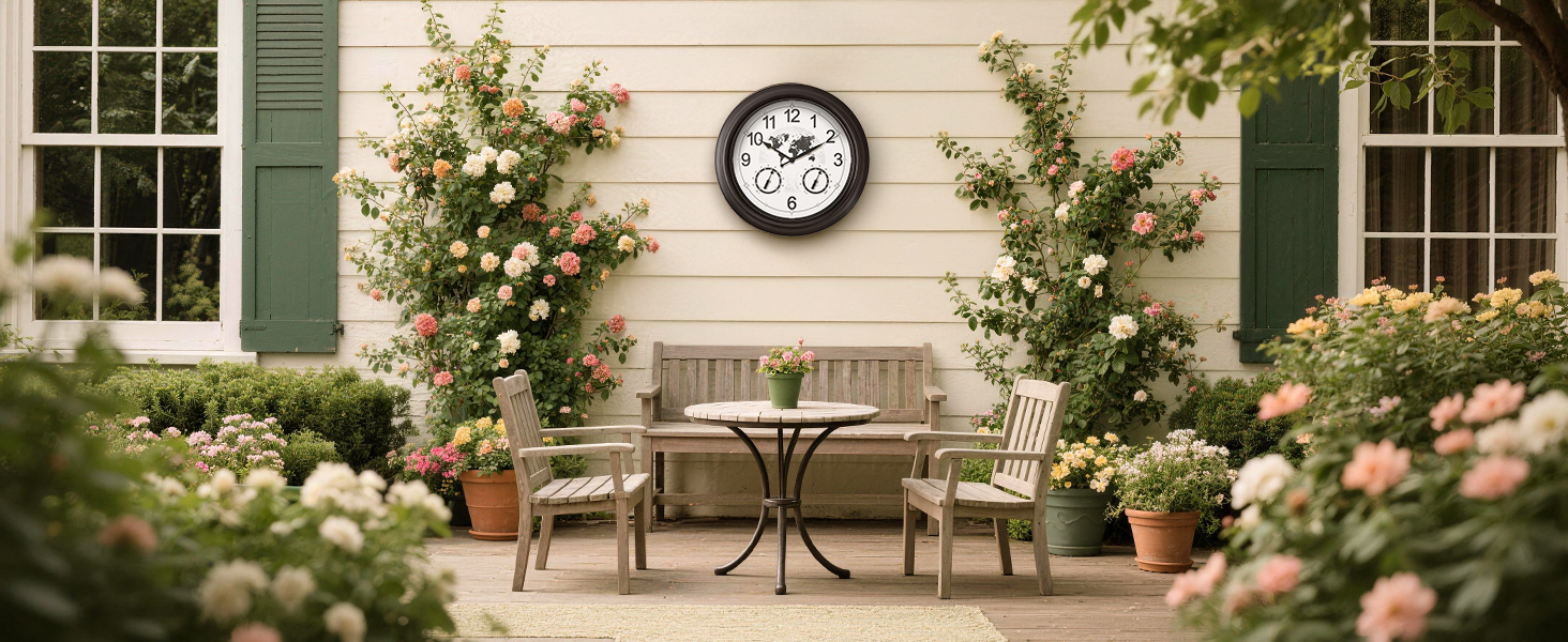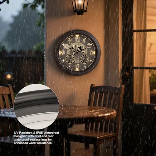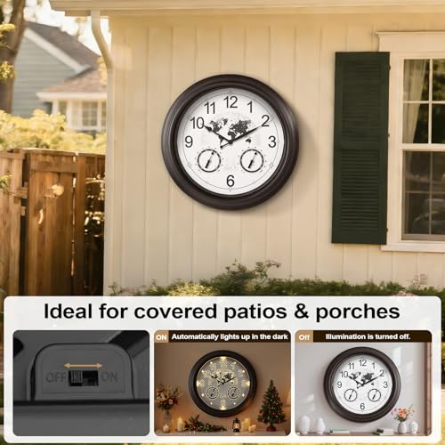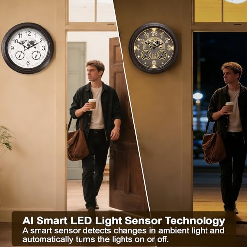 - 【Outdoor Clock with Intelligent Auto Light Sensing】The Pytha Sight outdoor waterproof garden clock 18 inch/45cm features a built-in AI light sensor that automatically turns the backlight on at dusk and off when ambient light increases—no manual operation required.