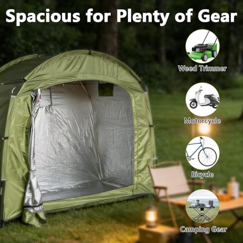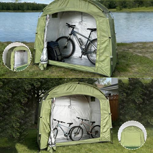 【High-quality Materials】This outdoor bike storage garage is made of 210D Oxford fabric with a silver coating for excellent water and UV protection. 8mm thick fiberglass poles ensure the stability of our outdoor bike tent. Choose our outdoor bike garage to protect your bicycle, motorcycle, and tools from sunlight, rain, and dust.