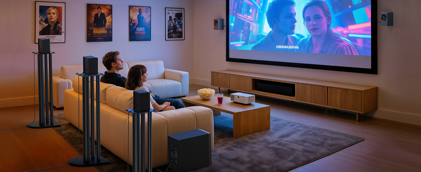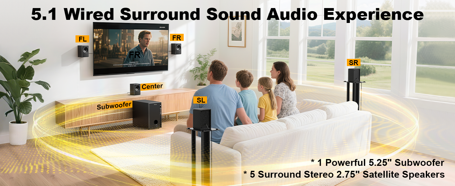 - Placement of the Home Theater Speakers: Equipped with 2 rear and 2 front speakers and 1 center speaker, the A55 sound systems with subwoofer projects sound from every angle. Wired connection between subwoofer and satellite speakers providing a stable and reliable experience. With the 360° Aural enjoy design, the 5.1 home theater surround sound systems ensure you’re immersed in the story, wherever you sit. Corners or walls tend to amplify low frequencies, so try positioning the subwoofer near these areas.