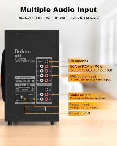 - Connectivity options are abundant: Our Bluetooth home theater surround sound system offers both 5.0 Bluetooth and multiple wired connections include AUX, RCA, USB, SD Inputs to meet your specific needs. It also has a built-in FM Receiver with Amazing Reception. USB/SD input. (Note: A55 does not support DTS decoding and not compatible with Dolby Audio/Atmos.)