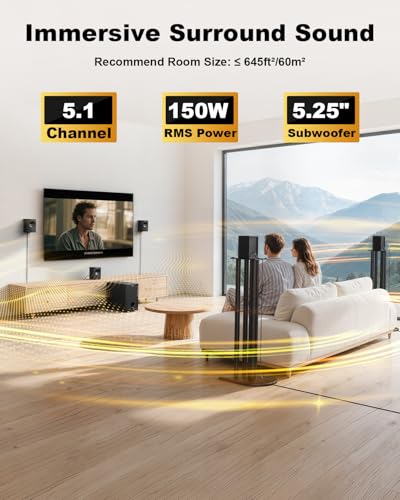 - 600Watts Peak Power: Our home theater system speakers, deliver an impressive 600 watts of peak power. Equipped with a 5.25-inch subwoofer and a built-in receiver, you don't need to connect another external one, these speakers deliver the perfect balance of treble, bass, and mids in any setting. Small sound systems are compact and designed to fit well in limited spaces.