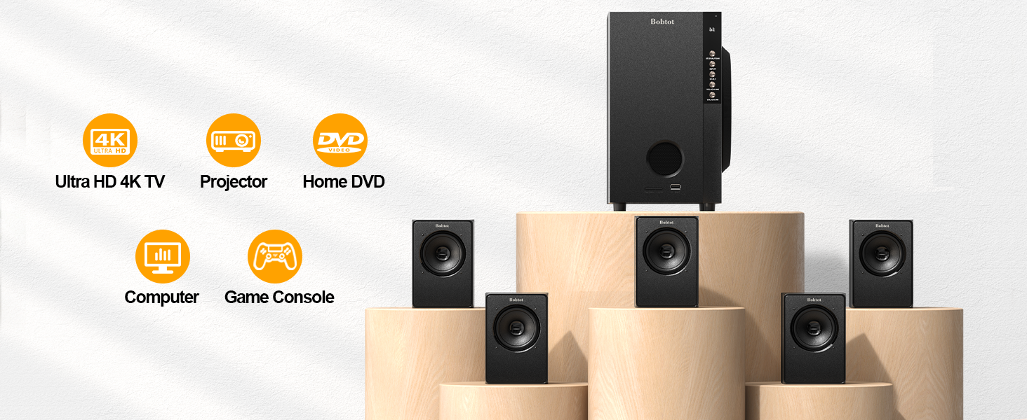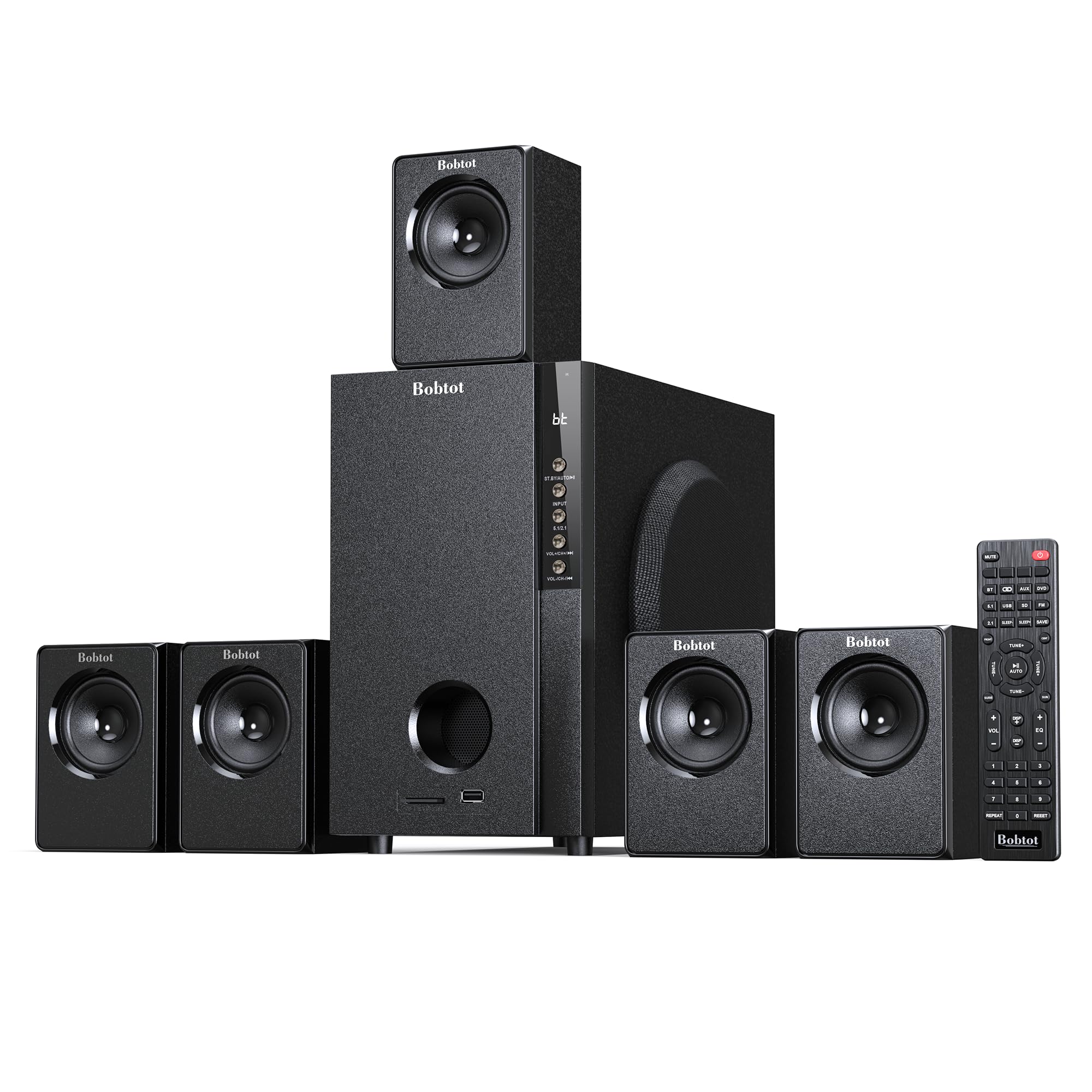 - 5.1 Channel Surround Sound Speakers: Immerse yourself in a superior audio experience with the Bobtot 5.1 home surround sound system for TV. Featuring two modes, 5.1 and 2.1 channel, easily switch between them using the convenient remote control or the front panel on the subwoofer. With the pro surround function, elevate your sound enjoyment to a whole new level for home theater sound system.