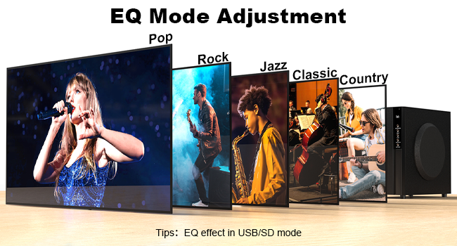 - Full Function Remote: Each speaker including the subwoofer has its own volume control on the remote. Using the remote we could turn down the bass, turn up the center speaker and other satellite speakers. You can also press the EQ button to choose your interest EQ curves such as Rock, Pop, Classic, Jazz, Country under USB/SD mode