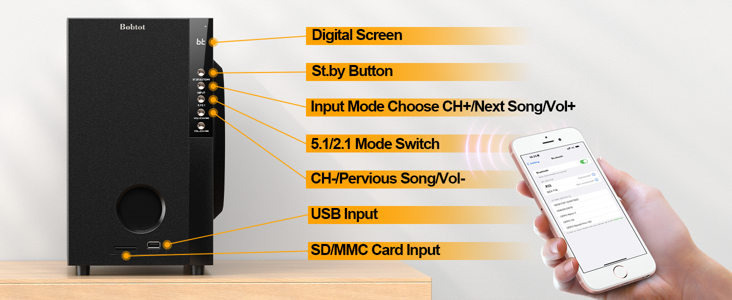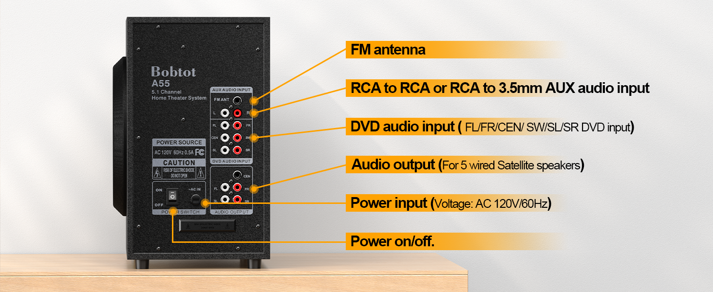 | Easy to Connect and Set Up | Step 1: 5 small speakers are wired connect to the "AUDIO OUTPUT" slots of the Subwoofer. Step 2: Turn on the subwoofer and choose "BT" mode, connect your smart phone to Bluetooth named "Bobtot A55", to ensure the whole system is working normal. Step 3: Connect the cable to the correct "AUDIO INPUT" Slot of the subwoofer and choose the "INPUT" mode you want to use. |