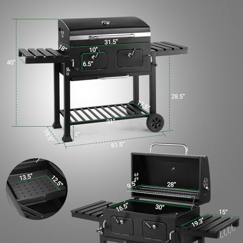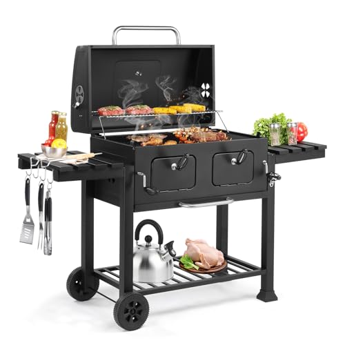 - [Convenient Side Charcoal Doors]: Two separate charcoal access doors let you add fuel without moving food or removing grill grates. Designed with cool-touch handles for enhanced safety, this charcoal BBQ keeps food warm on racks away from direct heat even with the lid closed. The drawer-style ash pan facilitates cleaning and prevents ash buildup inside the barbecue.