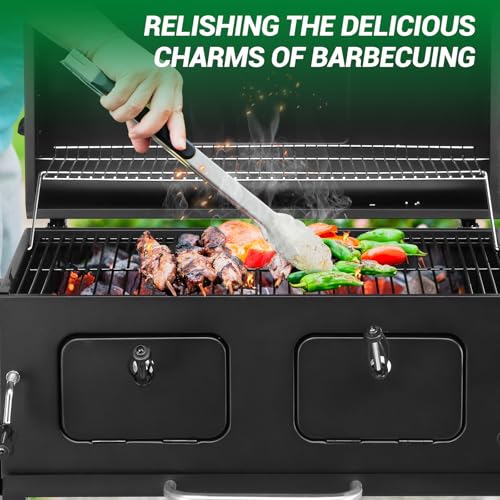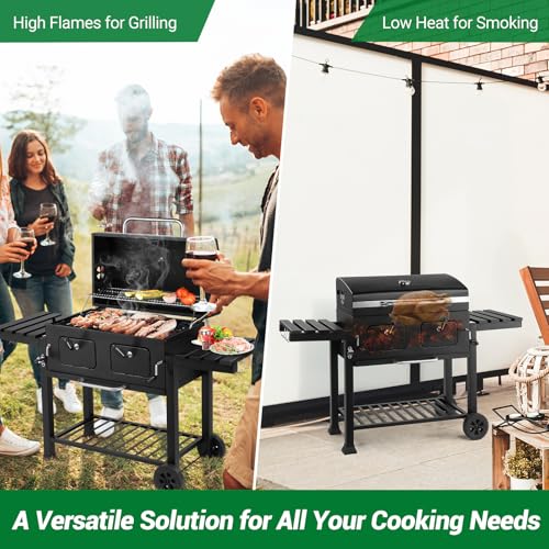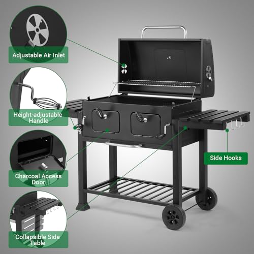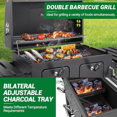- [Dual Adjustable Charcoal Grates]: Equipped with two independently liftable charcoal grates, this barbecue grill allows you to control temperatures on each side for precise heating of different foods. Easily adjust charcoal tray height via dual handles to switch between high-heat grilling and low-heat simmering modes. You can cook different meats and vegetables simultaneously, while the stainless steel warming rack keeps food warm and side doors provide convenient charcoal access.