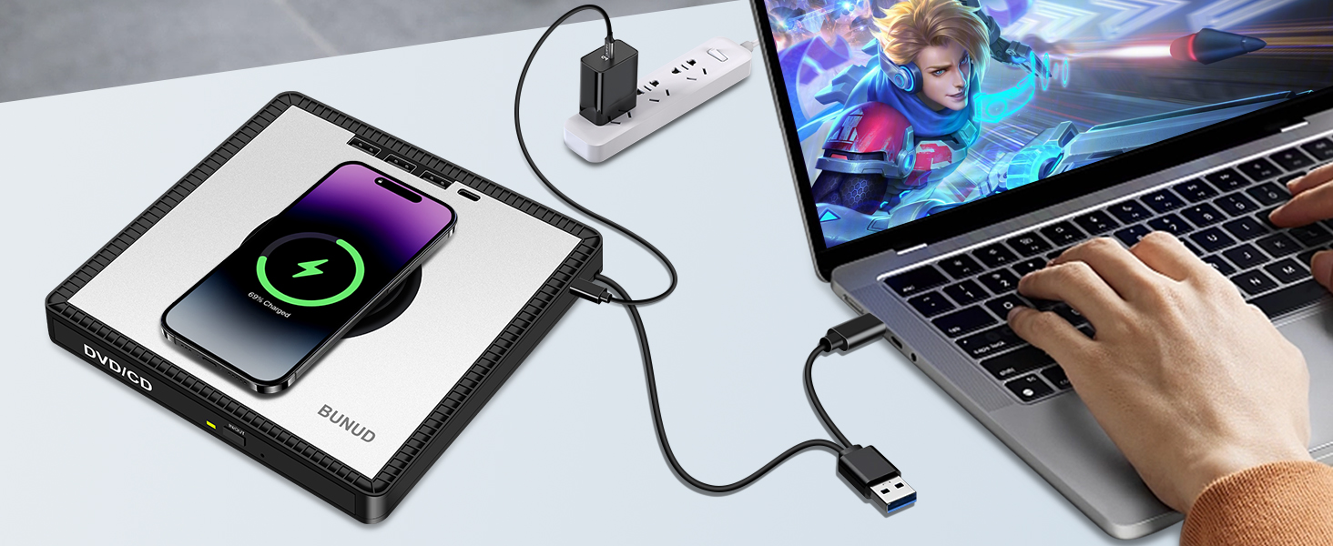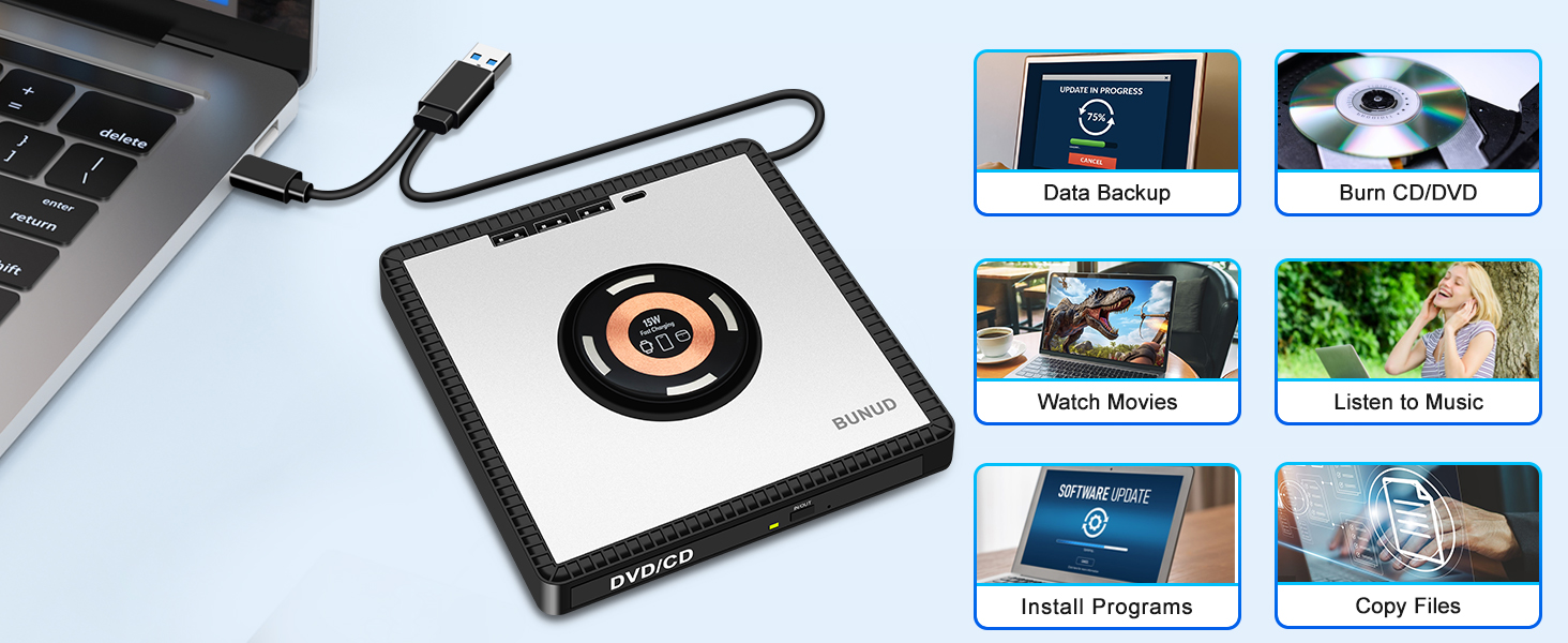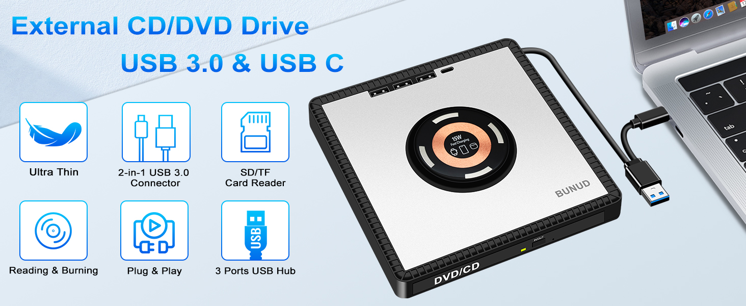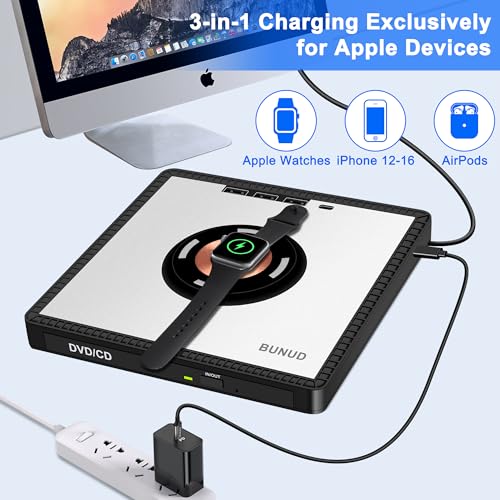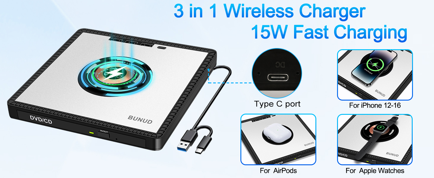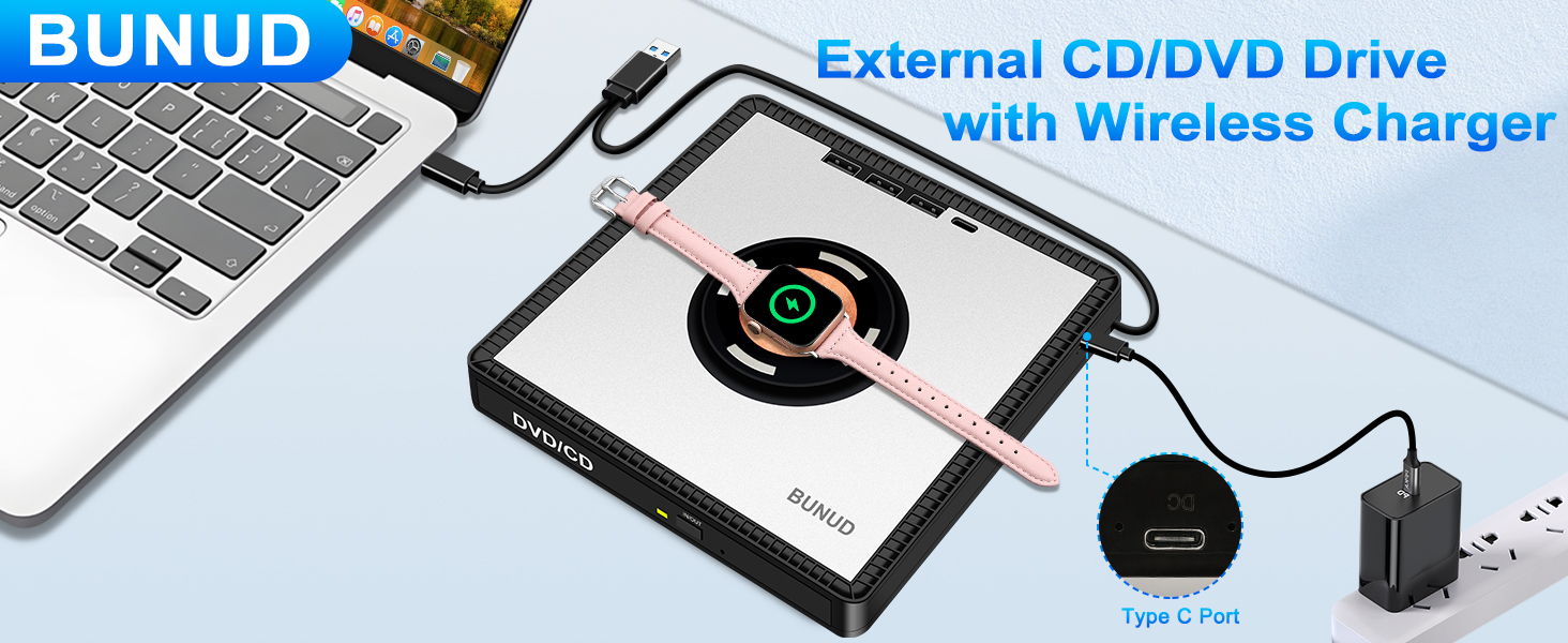 - Uniue Design for You: The CD reader for Laptop not only reads/burns CDs/DVDs but also serves as wireless charger, you can use it fast charging for your iPhone12-16/Apple Watches/AirPods. Eliminate cable mess and maximize space. The wireless charging function make you get charging freedom, you can carry it anytime anywhere. And BUNUD cd drive provides considering service and 1 year quality guarantee. If you have any questions about this CD player for laptop, please contact us, we will reply you within 24 hours