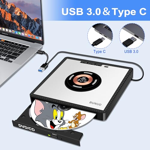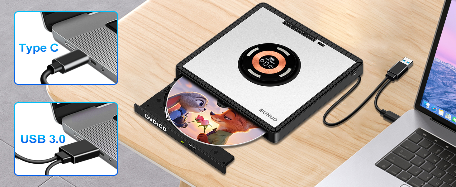 - Plug & Play External CD DVD Drive: BUNUD External DVD Drive for laptop have two connectors — USB 3.0 & Type C, just plug it and insert the disc and it will be detected and used immediately. External CD drive has an independent SD/TF card slot, 3 USB ports and 1 Type C ports, 2 Type c power ports. You can transfer photos and videos directly from SD/TF card into the computer, USB Hard Drive and flash drive