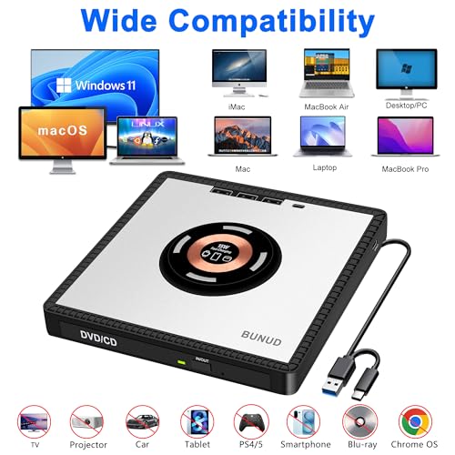 BUNUD External CD DVD Drive: USB 3.0 CD Burner DVD Writer Reader External with 3 USB & SD/TF – USB C Portable DVD Player for Laptop Windows 11 PC Mac with 15W Fast Charging