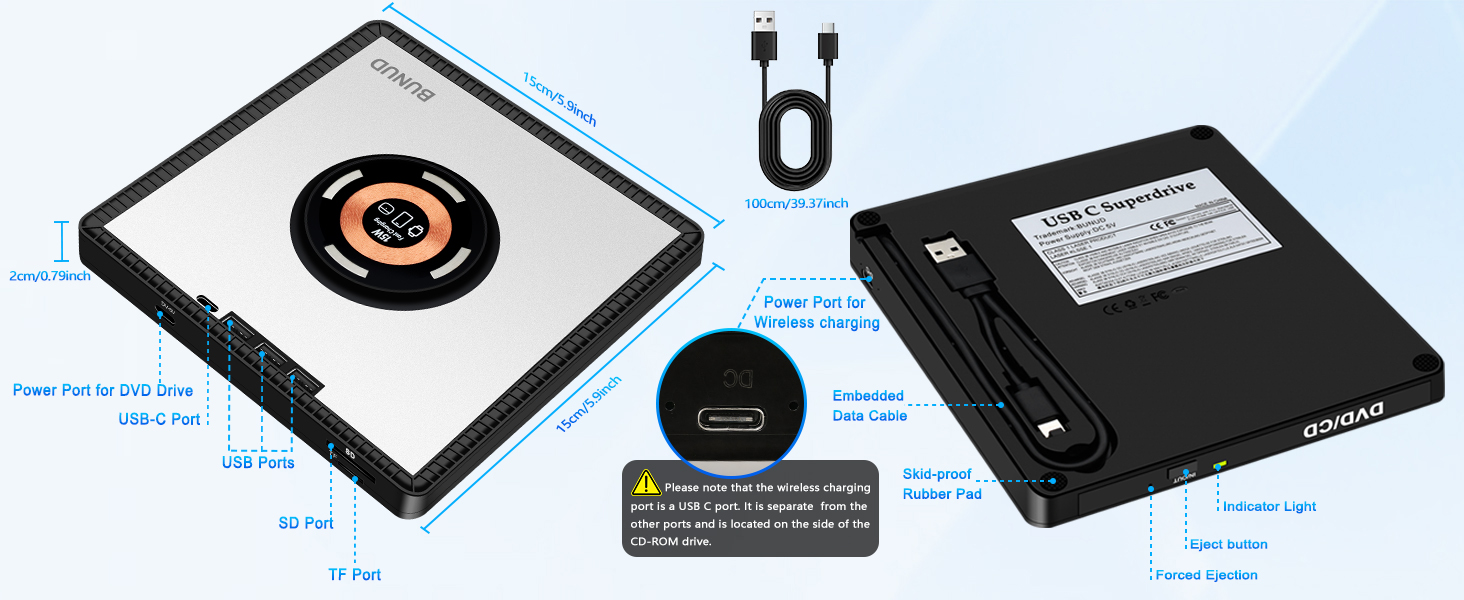 - Some Thing to Know Before Buying: 1. For a better charging experience, you should use a power adapter with a minimum output of 15W, and the power adapter is not included 2. The wireless charging port is a Type C port. It is separate from the other ports and is located on the side of the CD-ROM drive 3. Connect the USB 3.0 Type-C data cable (Embedded under the drive) to your computer—do not confuse it with the power cable 4. Please check the compatibility list carefully to ensure the drive works with your device before purchasing