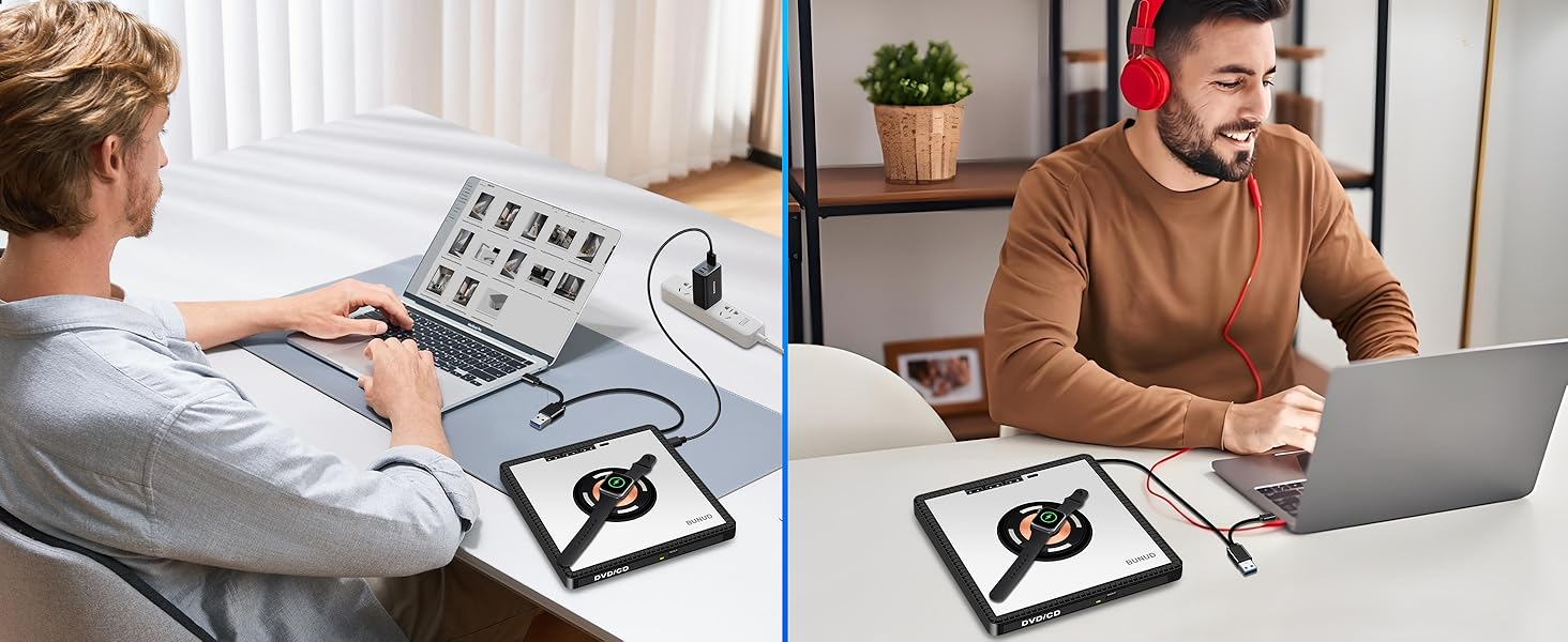 - Compact and Portable: BUNUD external CD/DVD drive for laptop is slim and it is only 0.8lb. Embedded cable design make it easy to organize, skip-proof rubber pad prevents sliding on the desktop, usb dvd drive external can easily fit into your bag, ideal for home, office, travling or business