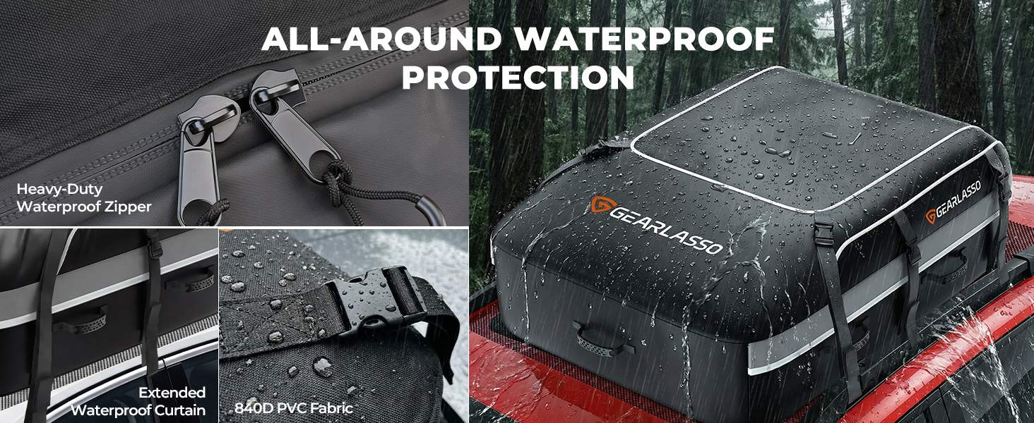 【840D Waterproof Protection】 Made from thick 840D PVC fabric with a waterproof zipper and extended rain curtain to keep luggage dry in rain, snow, and road splash
