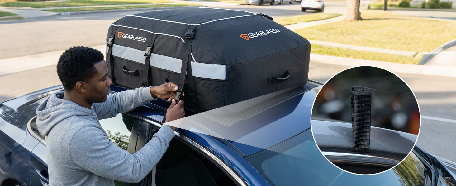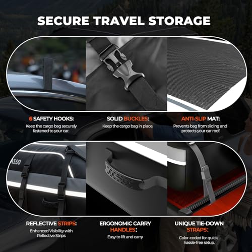 【Secure & Stable】 Includes anti-slip mat, 6 door hooks, solid buckles, and 4 extra straps to keep the cargo bag firmly in place,even on long drives and rough roads