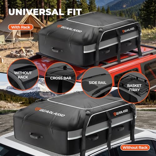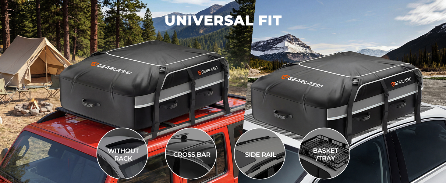 【Large Capacity & Universal Fit】 Fit Designed for cars, SUVs, and vans. Installs securely with or without roof rack, cross bars, side rails, or basket systems—ideal for road trips and family travel