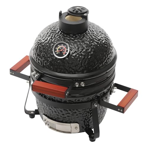 Ceramic Charcoal Grill & Smoker, 12.6 Inch Portable Outdoor BBQ Oven with 20mm Thick Ceramic & Bamboo Handles, Built-in Thermometer for 50-800°F Cooking, Ideal for Patio Garden Camping Picnics