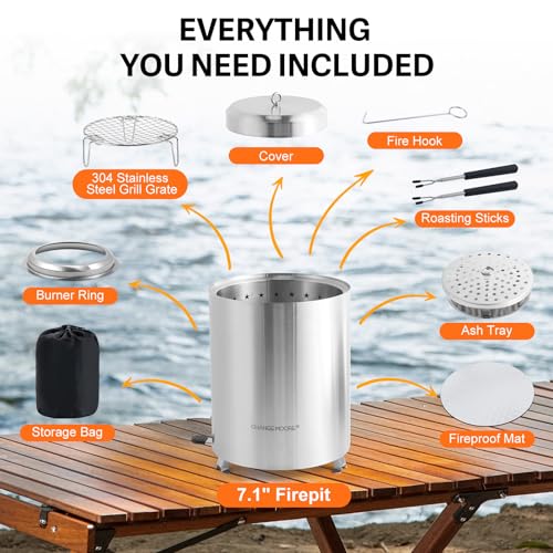 CHANGEMOORE Tabletop Fire Pit Set & Carry Bag, Smokeless Secondary Burning Table Top Firepit with Valve, Stainless Steel Smokeless Stove with Ash Pan, Airflow Rack, Mesh Grill, Fork, Hook, Ma