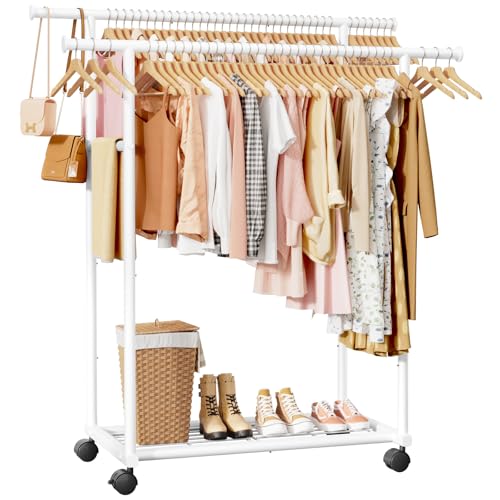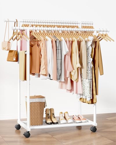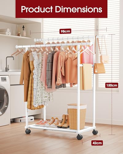 Clothes Rail – Double Rod Clothes Rack with Fixed Extension Rod & Universal Wheels, Clothing Rail with Built-In Shelf for Closet Organizers and Storage, 98cm x 42cm x 150cm, White