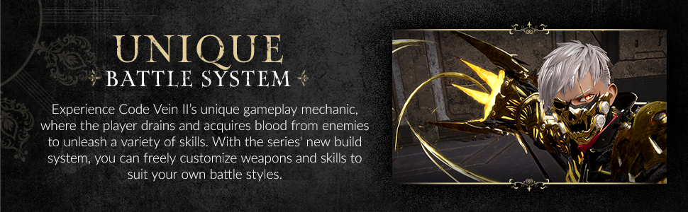 - Unique Battle System – Experience Code Vein II’s unique gameplay mechanic, where the player drains and acquires blood from enemies to unleash a variety of skills. With the series' new build system, you can freely customize weapons and skills to suit your own battle styles.