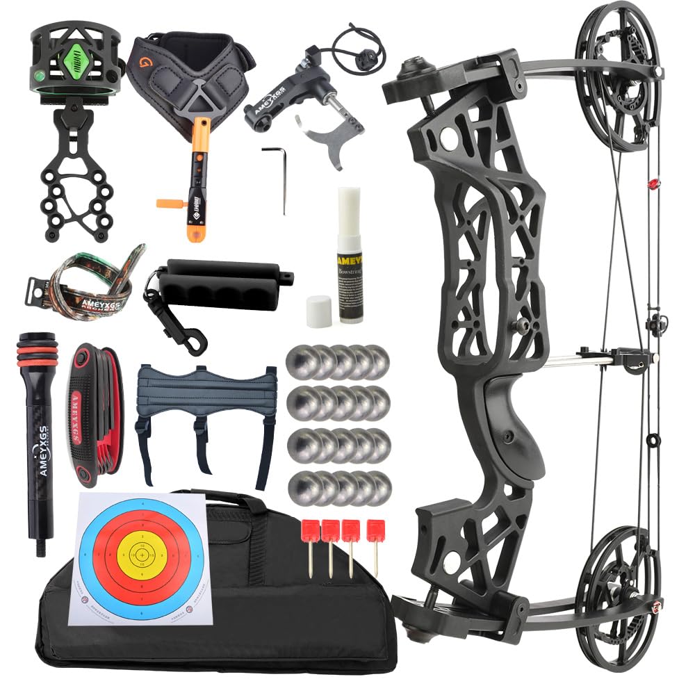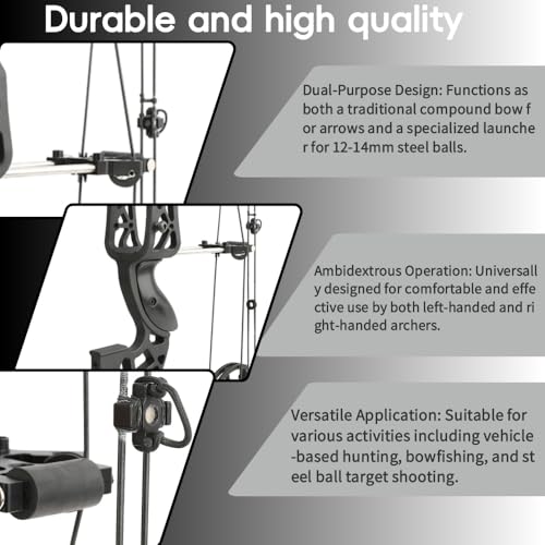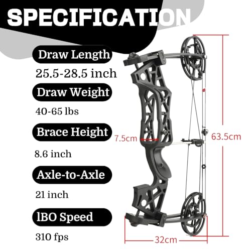 Item name: Archery Compound Bow Steel Ball Compound Bow For: Left hand and right hand Model: Nighthawk Material: aluminium alloy body; epoxy resin bow limbs Draw Weight: 40-65 lbs adjustable Draw Length: 25.5 inch-28.5 inch adjustable Brace Height: 8.6 inch Axle to Axle: 21 inch lBO Speed: 310 fps Steel ball application: 12-14mm Steel Ball Initial velocity: 12mm(115m/s) Arrow Initial velocity: 86 m/s Bow Size: 63.5×32×7.5cm Bow weight: 2kg Package: Compound Bow Set Set Include: 1* Compound bow 2* Bow riser stabilizer 1* sight (5 pin) 1* Arrow rest 1* Wrist Release 1* Bowstring wax 1* Wrench 6* Target paper 20* Steel balls 1* Bow bag 1* Arm guard 1* Arrow puller 1* Wrist strap 4* Target nails Note: 1. The real color of the item may be slightly different from the pictures shown on website caused by many factors such as brightness of your monitor and light brightness. 2. Please allow slight manual measurement deviation for the data. 3. DO NOT DRY FIRE (shoot the bow without arrow)! This will damage the bow and hurt yourself and the people around you.