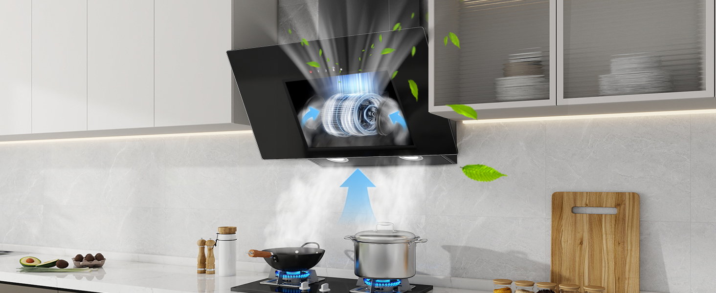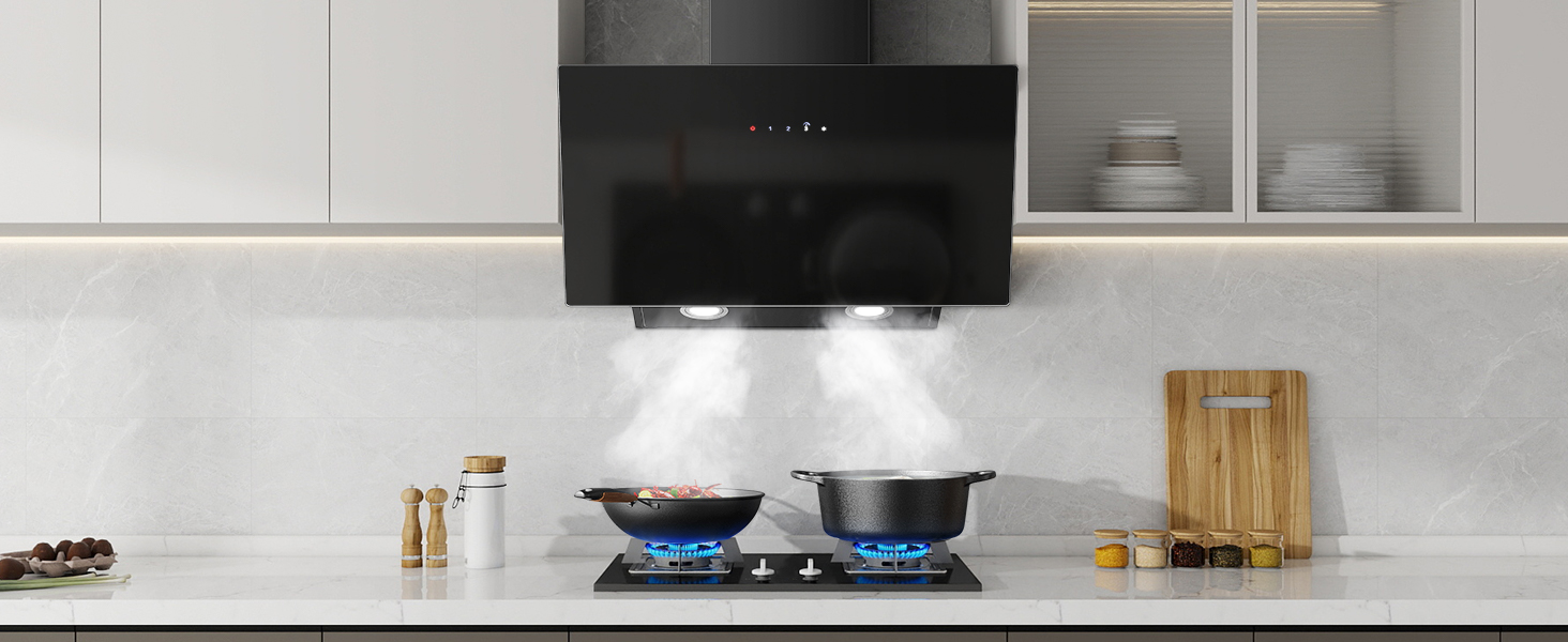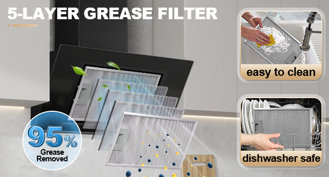 - Easy to Use & Clean: The extractor hood features high-quality safety glass and a precise touch control panel (3 Speed + Booster)) for intuitive operation. Its smooth surface is easy to wipe clean. The five-layer aluminum grease filter is highly effective at trapping grease and is dishwasher safe for convenient maintenance.