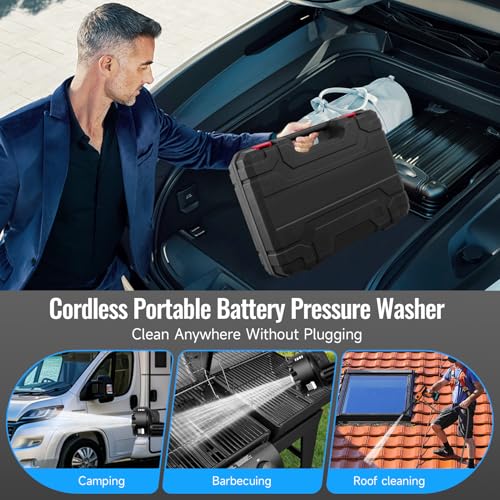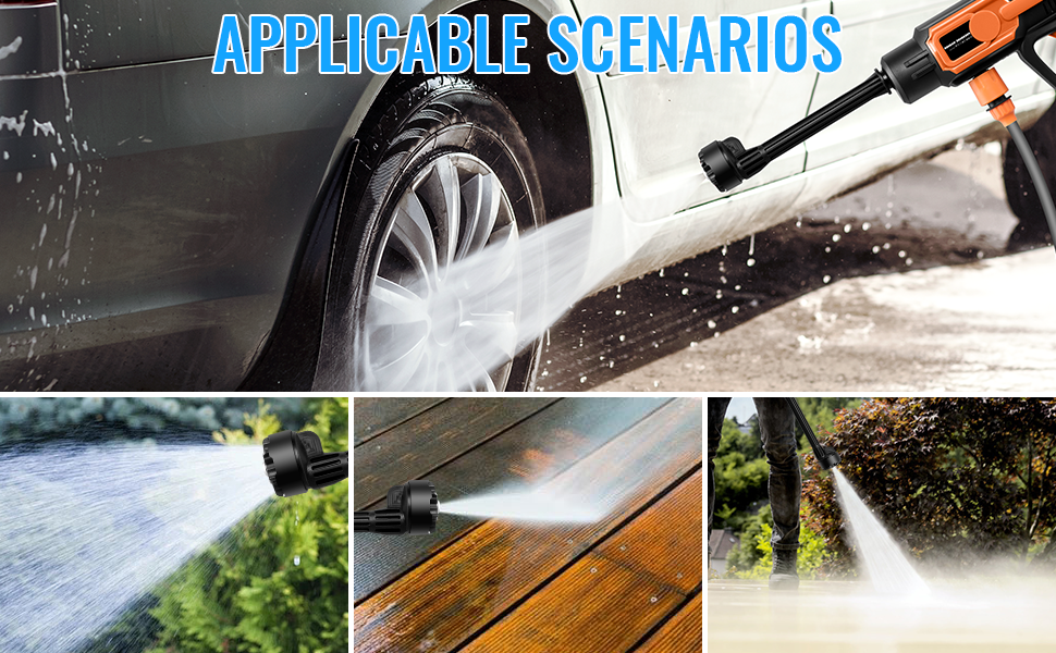- 【Versatile Water Source】The cordless pressure washer gun can draw water from any source, such as buckets, tanks, bottles, water ponds, pools, lakes, etc. This makes it a highly convenient tool for outdoor cleaning tasks, whether you're at home, at a campsite, or on the go. No need to worry about finding a water supply when you need to clean your car, patio, or outdoor furniture.