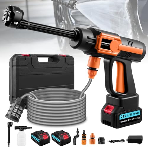 - 【All-In-One Accessory Jet Washer Kit】The portable battery pressure washer comes with a variety of accessories that make it powerful and versatile. The package includes: 1x Battery Pressure Washer, 1x 21V Fast Charger, 2x 3000mAh Battery, 1x Quick Connector, 1x Bottle Quick Plug, 1x Garden Hose Quick Connector, 1x 16.4ft Hose, 1x Water Filter, 1x 180° Swivel Head, 1x Foam Pot, 1x 6-IN-1 Nozzle, 1 x Storage Box, 1x User Manual.